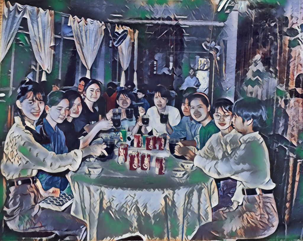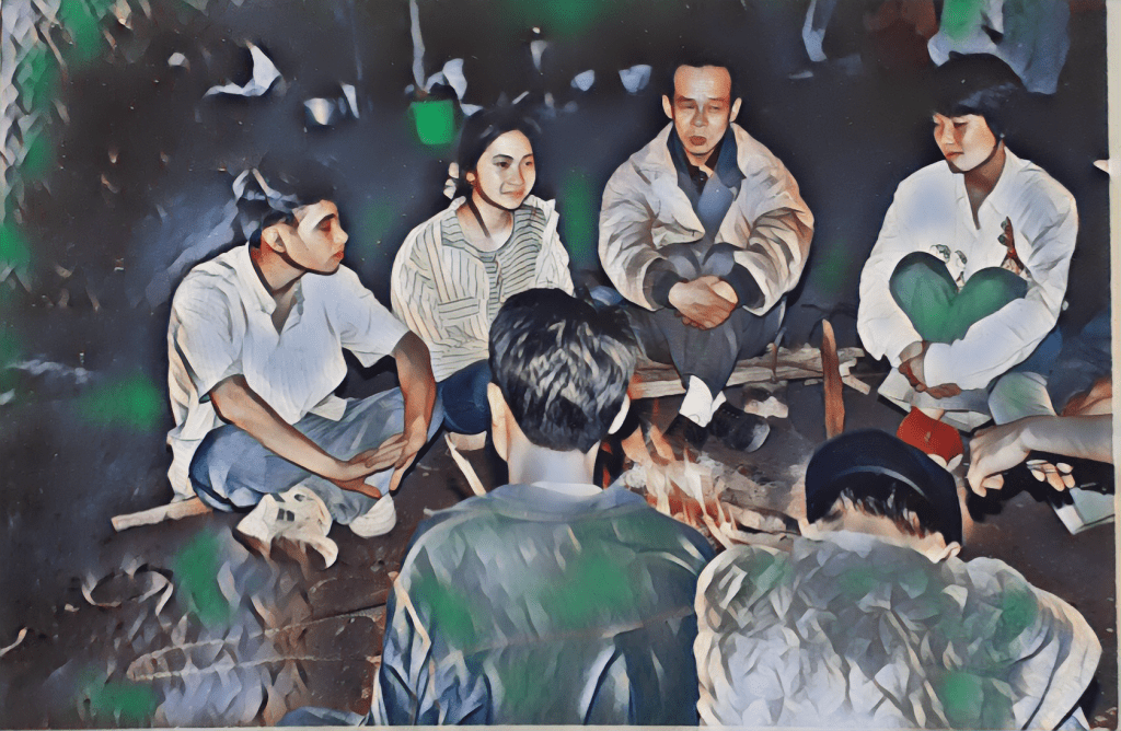 Hồi ấy, lớp 11-12 là một mớ hỗn độn giữa lo và vui. Lo học, lo thi, lo rớt Đại học. Lo ăn, lo chơi, lo chẳng có người yêu. Vui tụ (tập), vui tán (chuyện), vui thích ai đấy. Những kỷ luật trên lớp, những răn đe của “ông-bà-già”, và những định kiến của những thập niên 90 “set up” tôi và các bạn mình trong một thế giới nhiều lằn ranh đỏ. Những lằn ranh đỏ ngăn cách giữa “lo lắng tương lai” vs. “vui vẻ tận hưởng”, giữa “lễ giáo-truyền thống” vs. “bùng nổ-phá cách”, giữa “nề nếp-cao cổng kín tường” vs. “tự do-bộc lộ bản thân”. Bộn bề cạnh những lằn ranh đỏ, là chi chít các giờ học trên lớp buổi sáng, là kin kín những lớp chiều học thêm “luyện gà”, là những đêm dài chong đèn để “cày đề”. Sau những bộn bề và cau có thường ngày (ngày nay thế hệ các con chúng tôi gọi là stress), chúng tôi luôn cố tìm lại nụ cười trong những buổi trốn đi chơi chớp nhoáng khi bất ngờ nghỉ tiết (hoặc bùng tiết), là những buổi sinh nhật, là những sự kiện dạ hội, và đêm trại ở trường. Đó là lúc tuổi trẻ bùng sáng, như ánh lửa bập bùng trong đêm lửa trại cháy ấm lại sau những ngày đông giá rét. Những đêm ấy là những dịp chúng tôi háo hức chờ ngóng cả năm, để bùng nổ phá cách -vui hết mình, -hát hết sức, -bộc lộ hết bản thân; tám nhau, tám hàng xóm, và ôi chao, ăn cháo gà với khoai nướng sao mà ngon đến lạ!